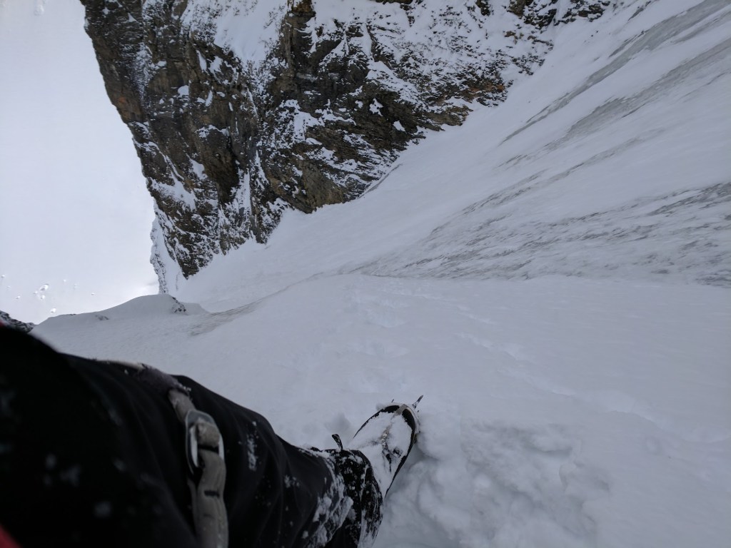 Chance and I are great friends, but in this instant, we were mad at each other and tempers were flaring. We took a pause at 2 am and brewed up (melted water), realizing being mad wasn’t going to solve any of our problems. We had a route description, but couldn’t pick the correct gully. Finally we chose one in which we could see the bottom, but not the middle. Our hand was forced by the fact that we couldn’t afford to spend much more time on the mountain (no food, no fuel, minimal water, and deteriorating weather). We left gear as we descended, using all of our slings—even my prusik cord. One nut anchors and chossy cam placements led us down to more steep snow. Similar to the conditions in the Ramen but worse; we made slow progress.