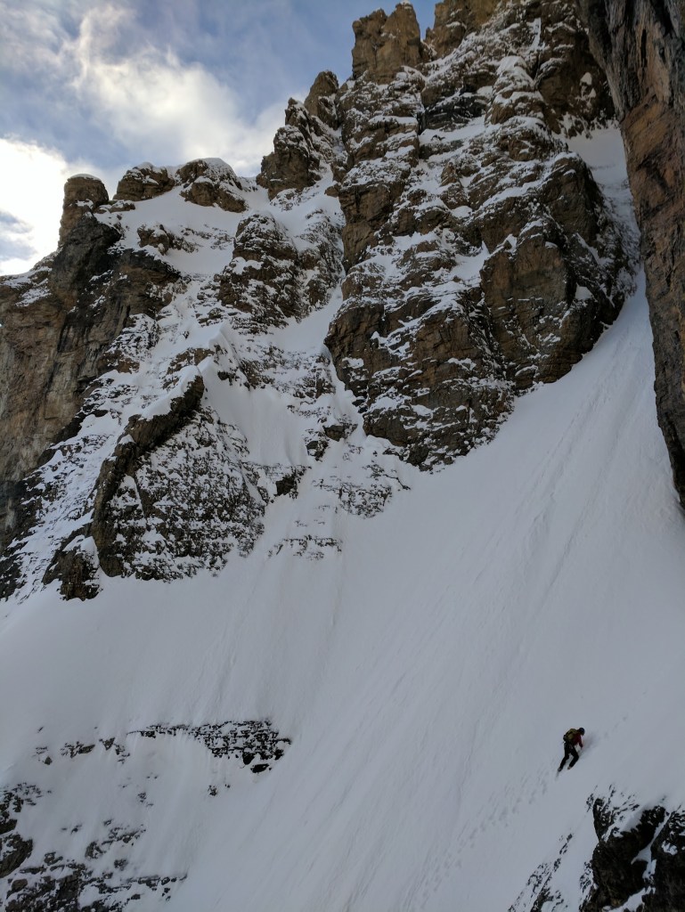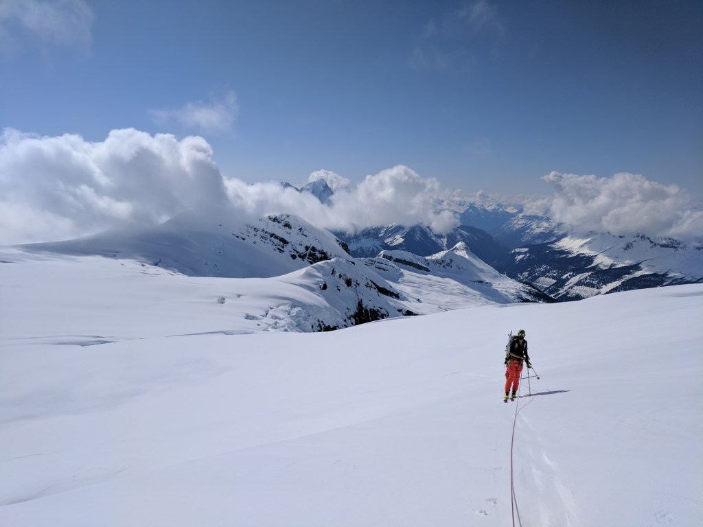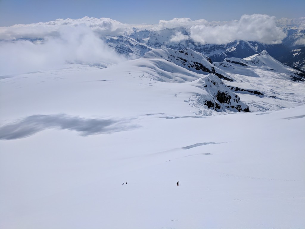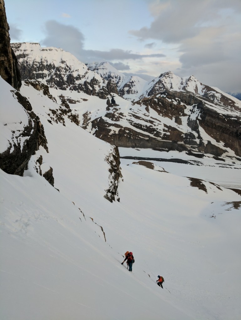 We left at 6 pm the day before the weather window, skinning down to the base of the route at 6500’. The first section was snow and had some considerable overhead hazard. We were able to move quickly and make our way up to the Cat’s Ears, where we did two 60-meter rappels to the base of an ice face. We kept trucking along the beautiful ridgeline until we got to the rock steps. There, the ‘5.8’ Beckey Chimney proved to be more demanding than expected. A few more simul pitches (climbing roped together at the same time with intervening protection) of some easy mixed terrain brought us to a nice bivy (campsite) at around 4 am. We then slept until 10 am and continued on the ridge. Some more rambling ridge terrain moved slowly on, as we tunnelled through cornices and dealt with some deep snow. We finally got to the base of the “ice face”—which didn’t have any ice on it.