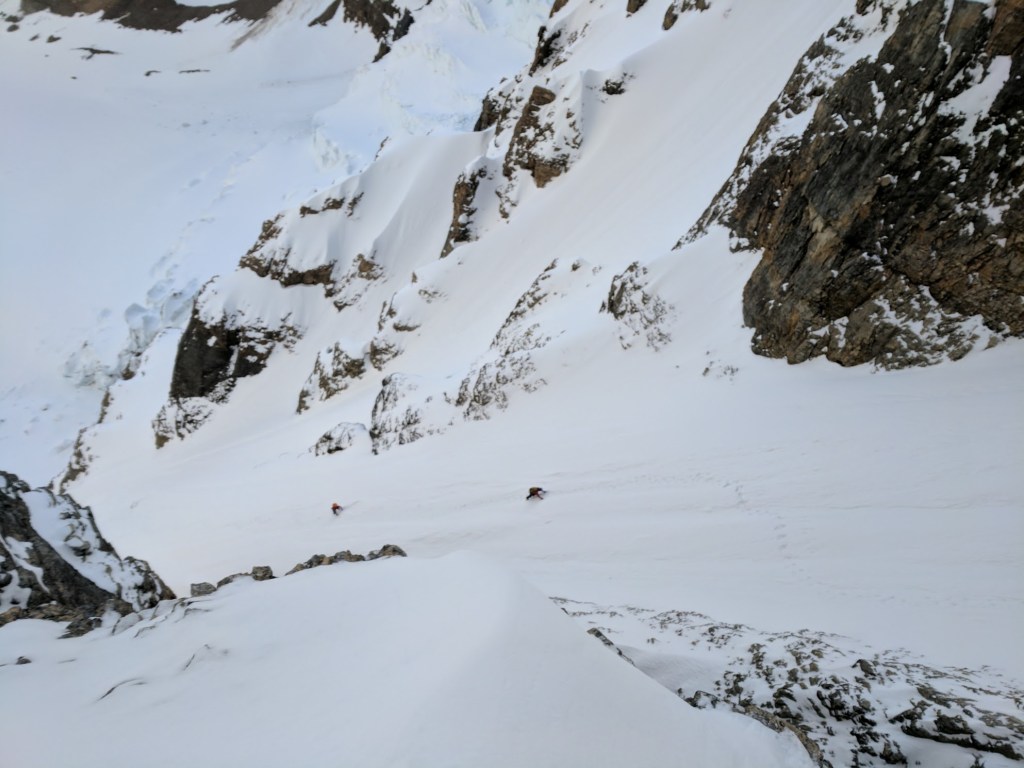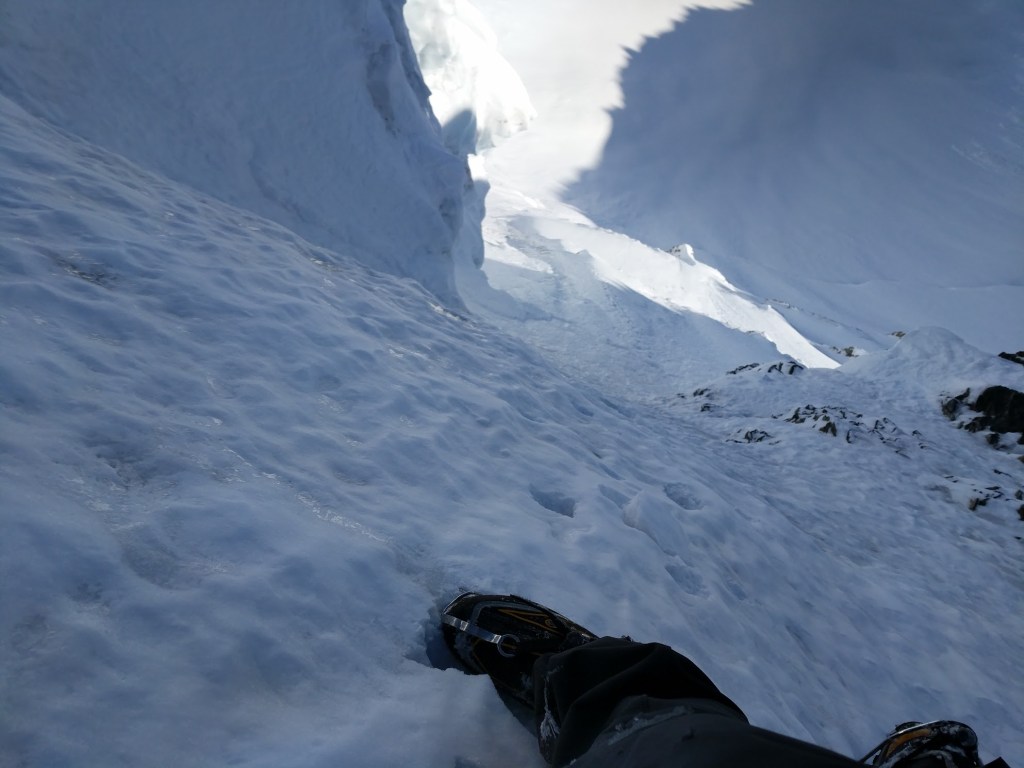 The snow was variable. The mini slide paths in the couloir proved firm enough to front point down, whereas the rest of the snow surface was slow and deep. The trick of the slide gullies was to get out of them when the barrage of rocks and ice funneled down the 5 foot deep paths. It was a risk, but I wanted to get off this thing so bad—the safety of the Kahiltna was right in front of us.