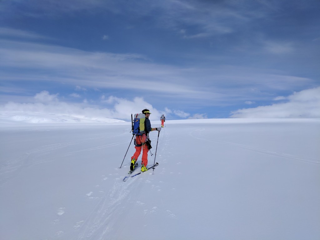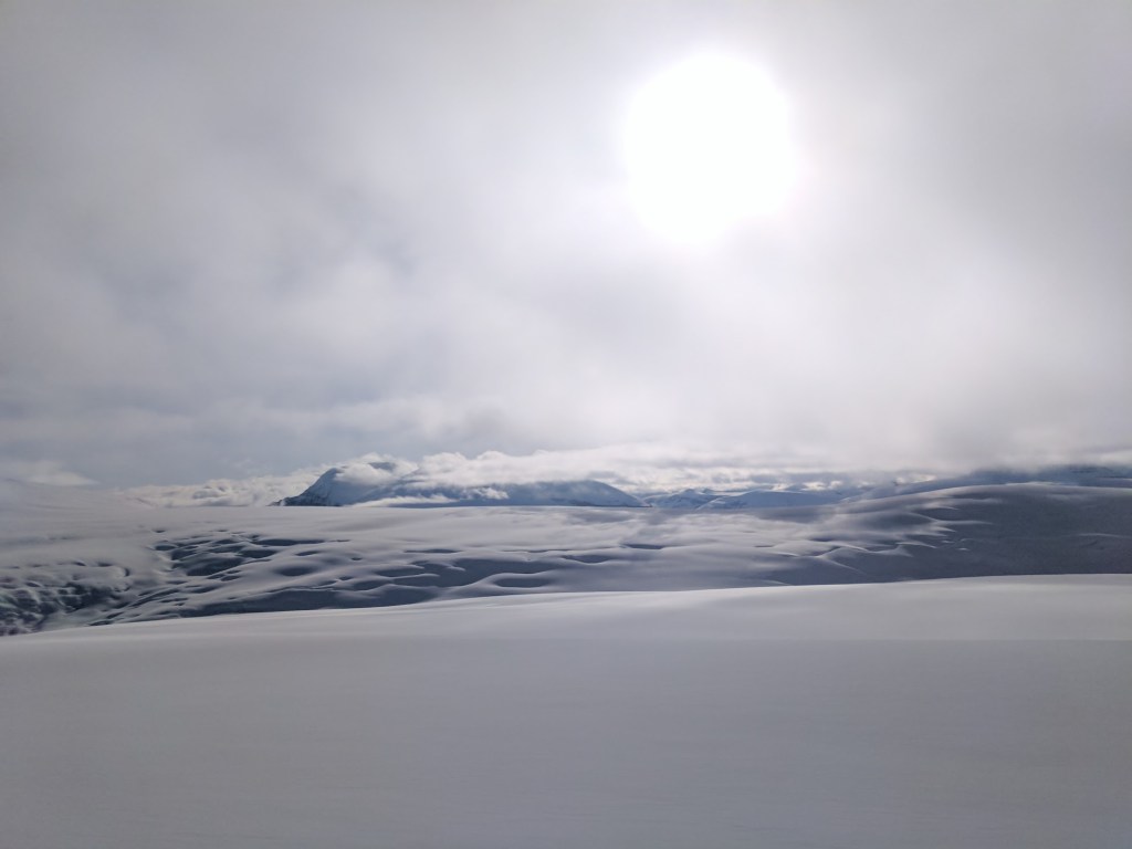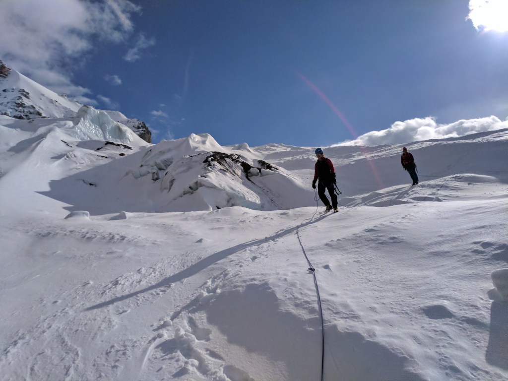 We had planned on a single push effort. But, due to the weather, we decided to wait until the morning (to finish the ascent). After sending out (satellite) messages for weather info, we received confirmation that we would have climbable weather the following day. We slept. We woke to beautiful clear skies and the ability to see the route in front of us. A bit of new snow made trail breaking more difficult. But, after some chest-deep postholing, we arrived onto the summit plateau.