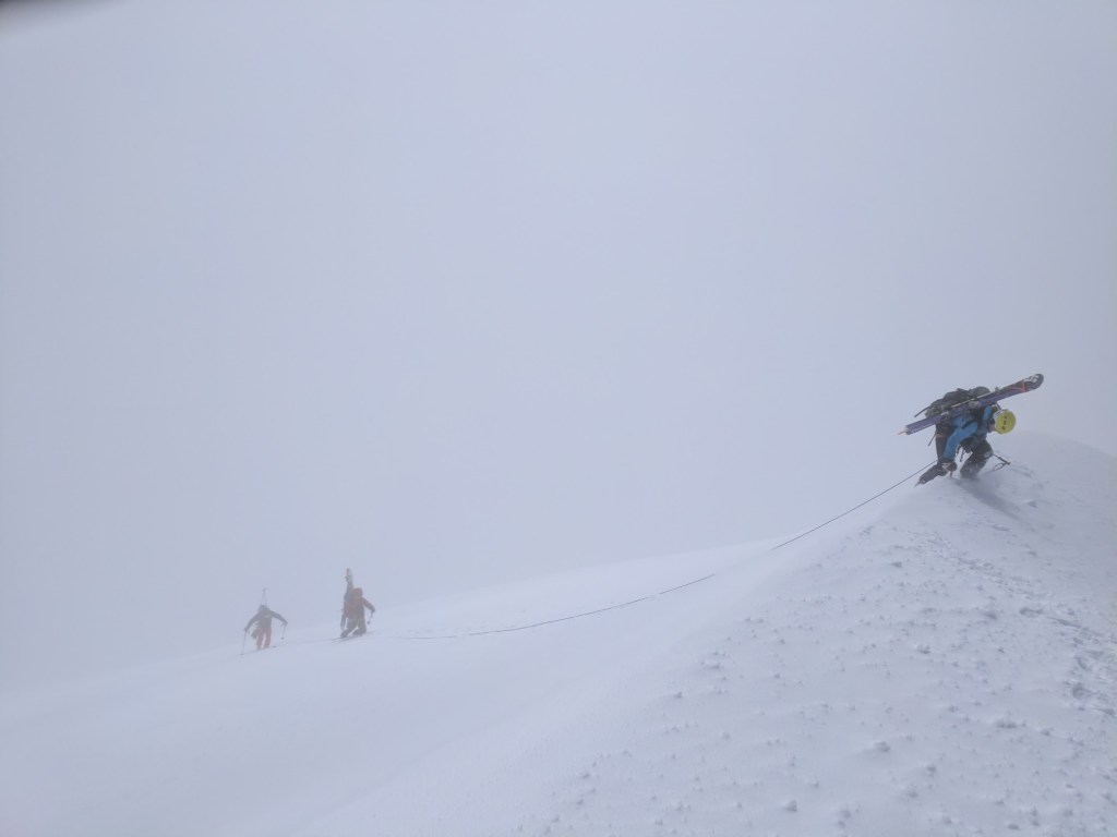 We then re-climbed a minor ridge leading to the Crosson-Sultana saddle and retraced our steps toward our cache near the summit of the former peak. During this process, a storm moved in early and we were enshrouded in a whiteout. Through the grace of deity or Darwin, Ryan stumbled across our gear cache before we ourselves stumbled into a crevasse.