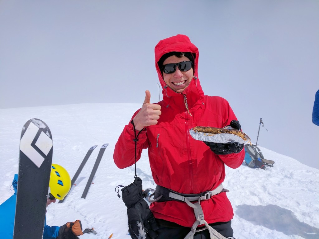 Just before hitting the saddle, Chance was downclimbing a snow face and he took a crevasse fall—fully overhead. After pulling him out, the four of us were a bit shaken. We still had lots of ridge to go and were unsure of the weather in the future. Ryan and Chris made the decision to bail back down from there, leaving Chance and I a bit more ‘out there’ than we were planning. (They were climbing in ski boots, and Ryan’s feet were in bad shape). We were sad to see those two go, but knew that we were going to be able to move a bit faster and focus more on the climbing. We continued moving up, passing another easy mixed pitch and an overhanging serac feature that required legit WI5 (approximately vertical) ice climbing, even for just a body length. We made it to the top of the famed Ramen Couloir and got caught in a whiteout. With no ability to see where we were going, we decided to bivy again. We split one mountain house (freeze dried meal) between us, beginning to strictly ration food.